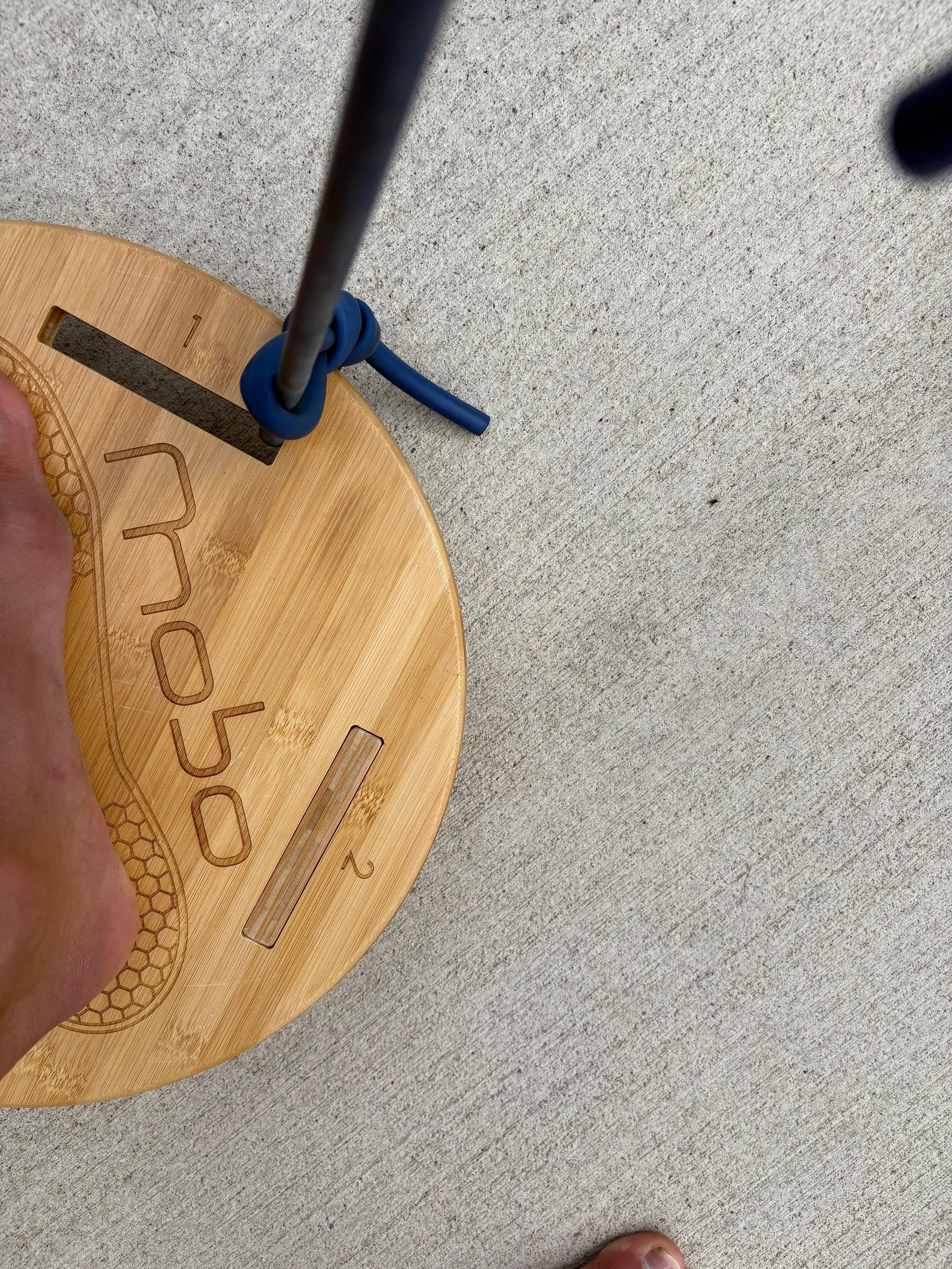 Stand up on the board – the band always goes in the hand OPPOSITE your foot. there’s a reason for this! The band will pull you not just down, but also work to twist your hip inward, requiring even better recruitment from your hip muscles with no extra training time. Set up matters!